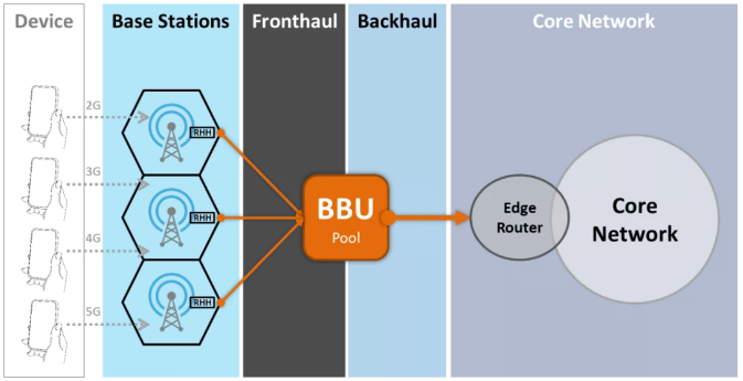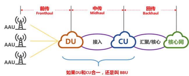 由于CU和DU合一部署为BBU,它们之间的传输就成为了内部接口。因此大家最关注的,还是BBU与核心网之间的传输:回传。