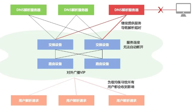 往往DNS解析服务和管控接口不可用,但路由服务正常,集群不会自动摘除这台服务器做流量迁移。在DNS服务器夯机场景下,大量的查询流量访问夯机的服务器就会造成严重的服务不可用现象,而该服务器也无法直接登录执行运维隔离操作。整个夯机故障从定位、处置到恢复时间太长,会导致用户的业务严重受损。