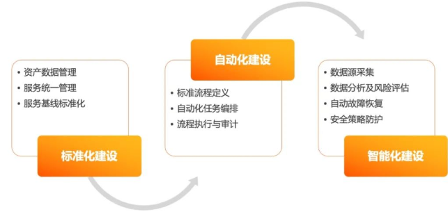 运维系统标准化建设阶段,主要聚焦于资产数据管理、服务管理与基线管理标准化三部分,目的是解决线上数据不一致、配置不一致和服务管理流程分散的问题。