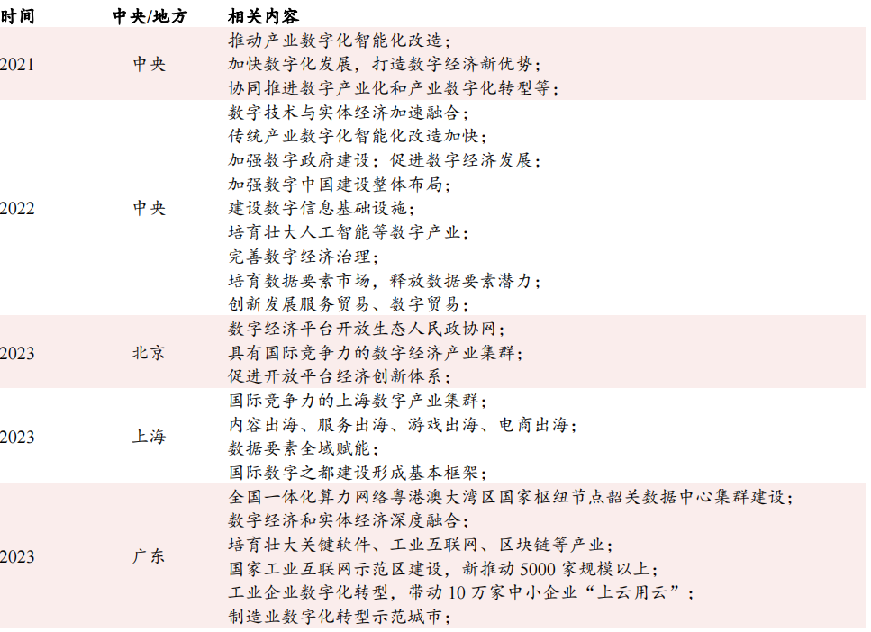 2022年政府工作报告中数字经济相关内容较此前显著增加,同时北京、上海、广东等多地2023年政府工作报告均有关于数字经济建设的提议,其中数字基建为首要的重点,其次是工业互联网、制造业数字化等产业数字化相关内容。因此,我们预计2023年政府工作报告中数字经济也将成为建设重点。