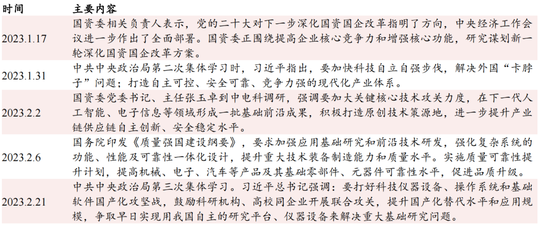2023年以来,高层对于自主可控、国产替代相关问题密集发声。中国政治局第二次集中学习,第三次集中学习上,习主席分别强调:“加快科技自立自强步伐,打造自主可控现代化产业体系”、“打好科技仪器设备、操作系统和基础软件国产化攻坚战”。讲话再次指明了信创产业发展的重要性和紧迫性,信创落地有望进一步加速。
