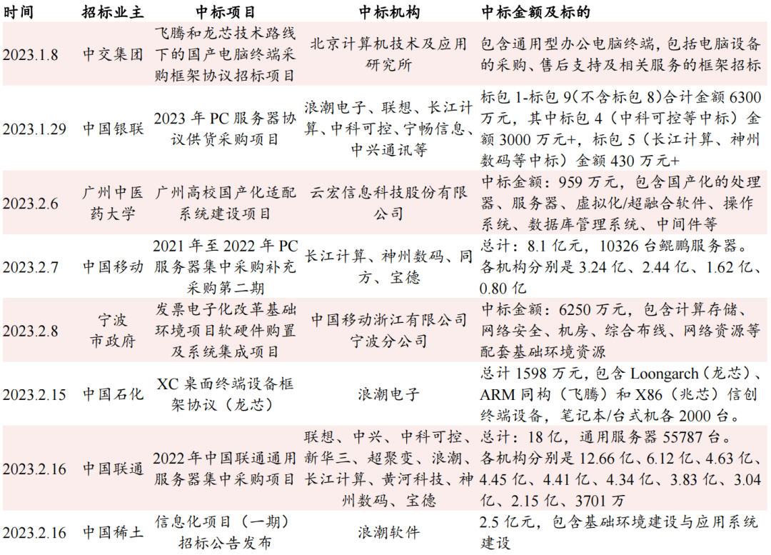 运营商采购国产化率提高。2月7日,中国移动《2021年至2022年PC服务器集中采购补充采购第二期》,采购47,845台服务器,国产芯片服务器占比26.41%,其中海光占比11.36%,鲲鹏占比15.05%。2月16日,中国联通《2022年中国联通通用服务器集中采购项目》中,海光芯片服务器(18.6%),共采购10300台,采购金额8.99亿元;鲲鹏芯片服务器(21.87%),共采购12108台,采购金额为10.07亿。