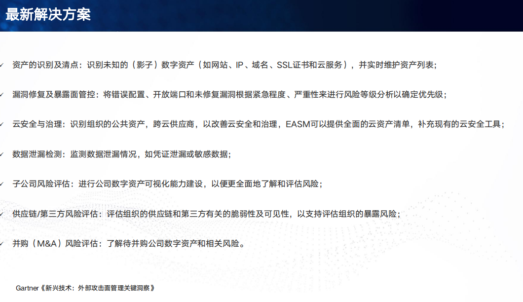 其中,在云安全与治理方面,曾永红提出要识别组织的公共资产,跨云供应商,以改善云安全和治理,EASM可以提供全面的云资产清单,补充现有的云安全工具;而在数据泄漏检测方面,曾永红提出要监测数据泄漏情况,如凭证泄漏或敏感数据;而在供应链/第三方风险评估方面,曾永红提出要评估组织的供应链和第三方有关的脆弱性及可见性,以支持评估组织的暴露风险。