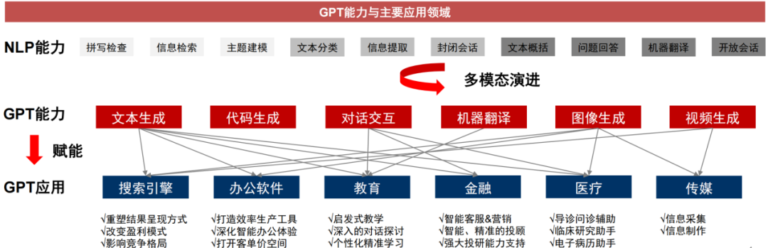 我们认为,这些基础能力将支撑GPT在通用与垂直领域的应用,新的应用领域出现也将基于这些能力的组合。例如,在办公软件领域,主要涉及GPT的文本能力;在教育行业,主要应用到文本、对话、翻译能力;在传媒行业,主要应用到图像、视频能力。