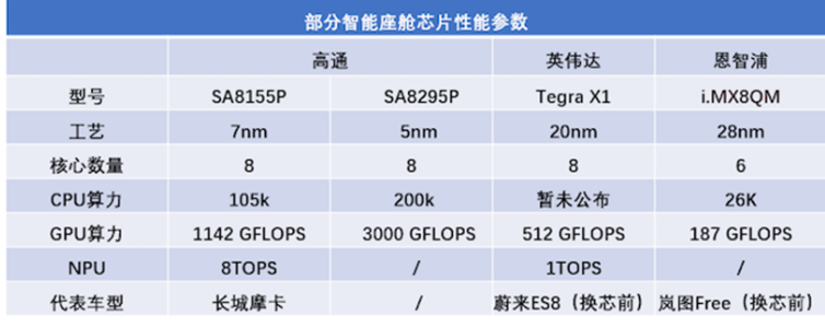 高通则进一步通过移动连接,满足智能化带来的高算力需求。在5月底举办的2023高通汽车技术与合作峰会上,高通展示了旗下很多款座舱芯片相关重磅产品。据悉,其中,骁龙8295采用与旗舰手机芯片平台骁龙888和888+同步的5nm制程,AI算力达到30TOPS。相比采用7nm制程的前代产品骁龙8155,骁龙8295的GPU整体性能提升2倍,3D渲染性能提升3倍,还增加了集成电子后视镜、机器学习视觉(后置、环视)、乘客监测及信息安全等功能。