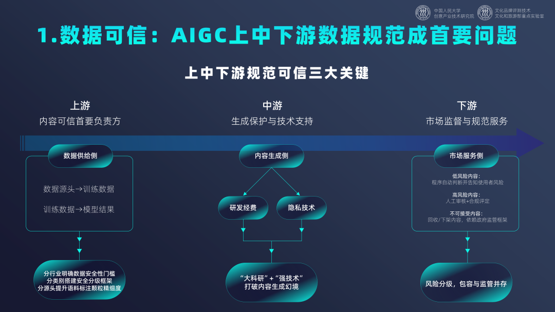 因此,应多点聚焦从数据整合到模型开发、从工具平台到内容创作、从行业服务到市场流通的内容生产全产业链,以包容审慎的监管政策保障数据规范、产业合规和产品可信。上游:分行业、分类别、分源头守护前端数据规范。中游:鼓励生成保护,以“技术赋能”打破虚假内容困境。下游:完善风险分级制度,包容管理与严格监管并存。