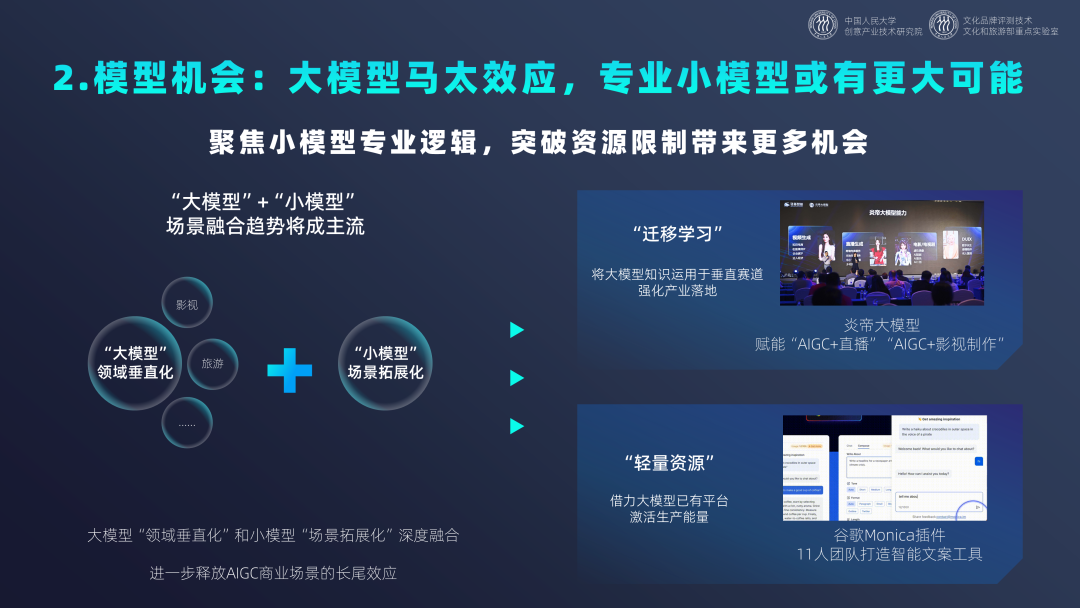 AIGC领域的大模型具有规模大、分析力强、准确率高等特征,但在高成本和高技术门槛等限制下,中小企业难以加入该领域。因此,大模型底层逻辑应与小模型专业逻辑并行,助力场景多元的专业小模型成为AIGC市场化发力重点。