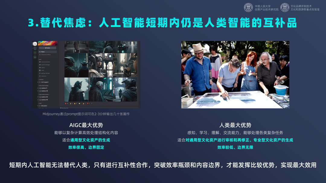 创作路径的差异导致了人机效能的不同,使得短期内人工智能无法替代人类,二者只有进行互补性合作,突破效率瓶颈和内容边界,才能发挥比较优势,实现最大效用。