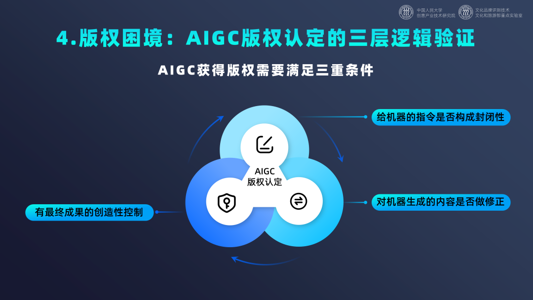 在有条件的肯定基础上,AIGC有获得版权的可能性,这需要满足三重条件:一是人类给机器的指令是否构成封闭性,即输入指令要保证原创和封闭,而不是采用已有的指令集;二是对机器生成的内容是否做修正,即输入指令之后,生成的内容是否作进一步调整和修正;三是人类拥有最终成果的创造性控制,即人类对作品的生成方式、解释方式等有最终控制。
