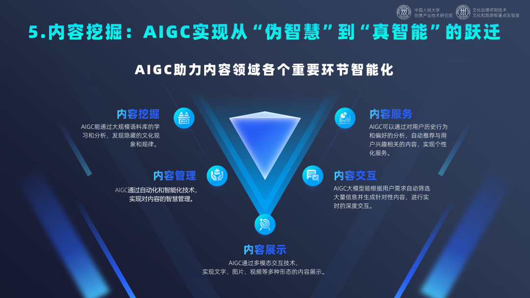 AIGC助力了内容领域各个重要环节的智能化。在内容挖掘上,AIGC能通过大规模语料库的学习和分析,发现隐藏的文化现象和规律;在内容管理上,AIGC通过自动化和智能化技术,实现对内容的智慧管理;在内容展示上,AIGC通过多模态交互技术,实现文字、图片、视频等多种形态的内容展示;在内容交互上,AIGC大模型能根据用户需求自动筛选大量信息并生成针对性内容,进行实时的深度交互;在内容服务上,AIGC可以通过对用户历史行为和偏好的分析,自动推荐与用户兴趣相关的内容,实现个性化服务。