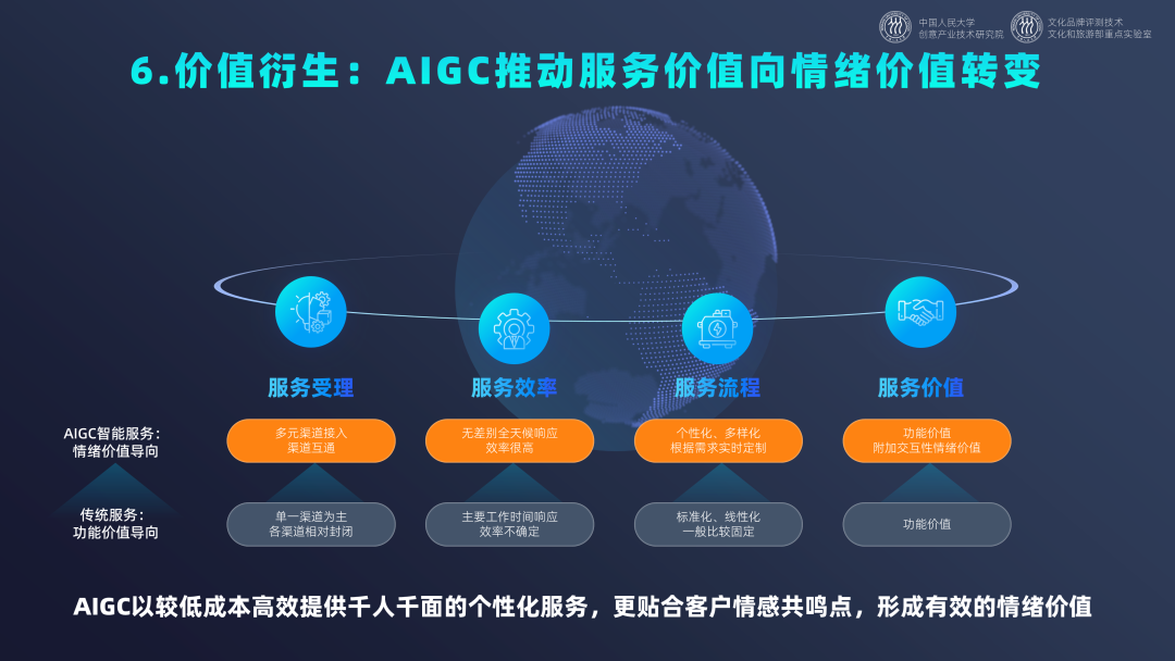 在服务受理方面,AIGC智能服务通过多元渠道接入,各渠道能互通;在服务效率方面,AIGC智能服务可实现无差别全天候响应,效率很高;在服务流程方面,AIGC智能服务的流程根据需求实时定制,特点是个性化、多样化;在服务价值方面,AIGC智能服务在功能价值之外,更重要的是提供了交互性情绪价值。基于以上分析,AIGC以较低成本高效提供千人千面的个性化服务,更贴合客户情感共鸣点,形成有效的情绪价值。