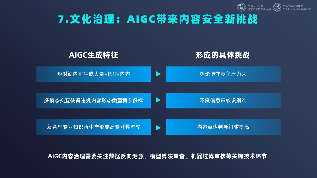 AIGC可在短时间内生成大量引导性内容,使得舆论博弈竞争压力增大;AIGC的多模态交互使得违规内容形态类型复杂多样,导致不良信息审核起来识别困难;AIGC对于复合型专业知识的再生产形成了高专业性壁垒,导致内容真伪判断门槛提高。基于这些因素,AIGC的内容治理需要关注数据反向溯源、模型算法审查、机器过滤审核等关键技术环节。