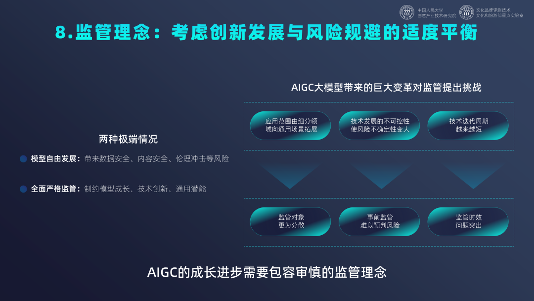对AIGC的监管需要考虑创新发展与风险规避的适度平衡。首先,其应用范围由细分领域向通用场景拓展,导致监管对象更为分散;其次,技术发展的不可控性(比如大模型的涌现能力)使得风险不确定性变大,导致事前监管难以预判风险;最后,技术迭代周期越来越短,导致监管时效问题突出。