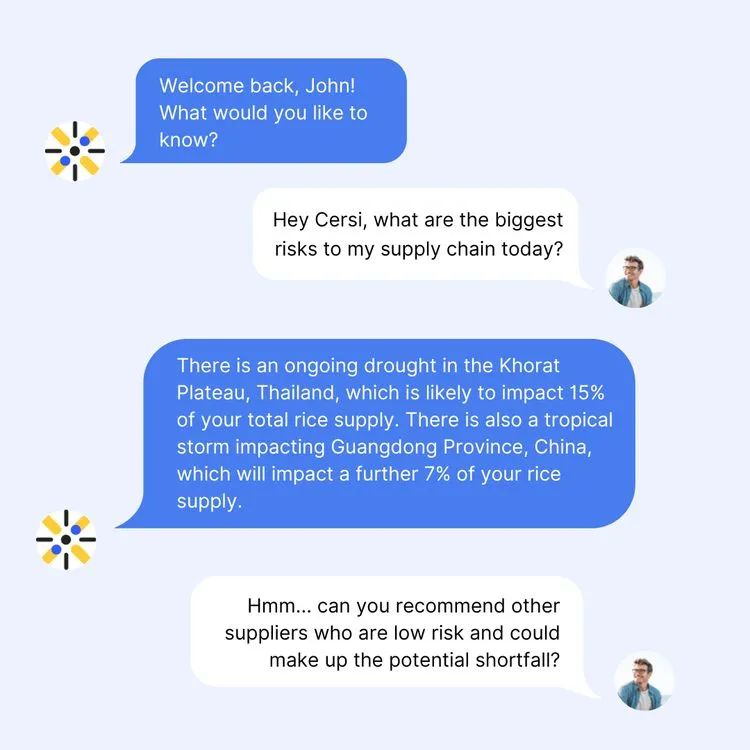 据称,Cersi利用数十亿个气候、经济和政治信号来预测农场层面的潜在供应链风险。企业可以输入其农场合作伙伴的种植区域或地址,实时了解气候模式、市场波动和其他因素对供应商履行合同能力的影响。用户可以向Cersi提出如何管理风险的问题,包括是否应该转向另一家供应商或投资于农场运营,以帮助提高作物产量。