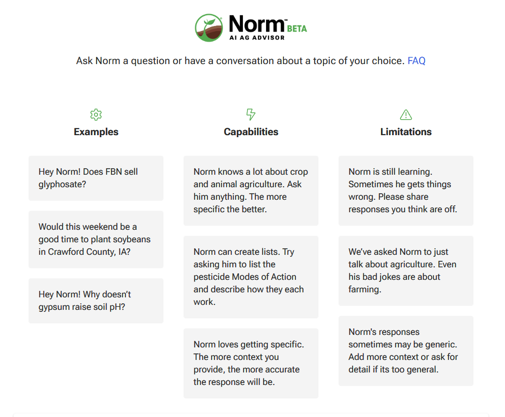 2023年2月,美国知名农业科创企业FBN宣布推出业界首个人工智能(AI)驱动的农艺顾问Norm,为农民提供广泛的农艺智能。Norm汇聚了公开的数据,如天气洞察、土壤监测、施用量、产品标签、当前事件、大学研究和种植者评论,以及FBN独有的数据源,让种植者可以就广泛的农艺、农场经营、动物健康和产品使用等问题进行查询。