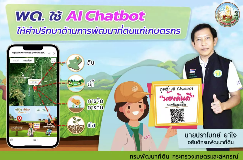 2023年10月,泰国土地开发部宣布推出人工智能聊天机器人Nong Din Dee。农民、学生或任何有兴趣的人都可以每天24小时方便快捷地获取土地开发信息,以利于农地开发。人工智能聊天机器人服务“Nong Din Dee”还可以查询各种服务、知识媒体、学术文章的信息。