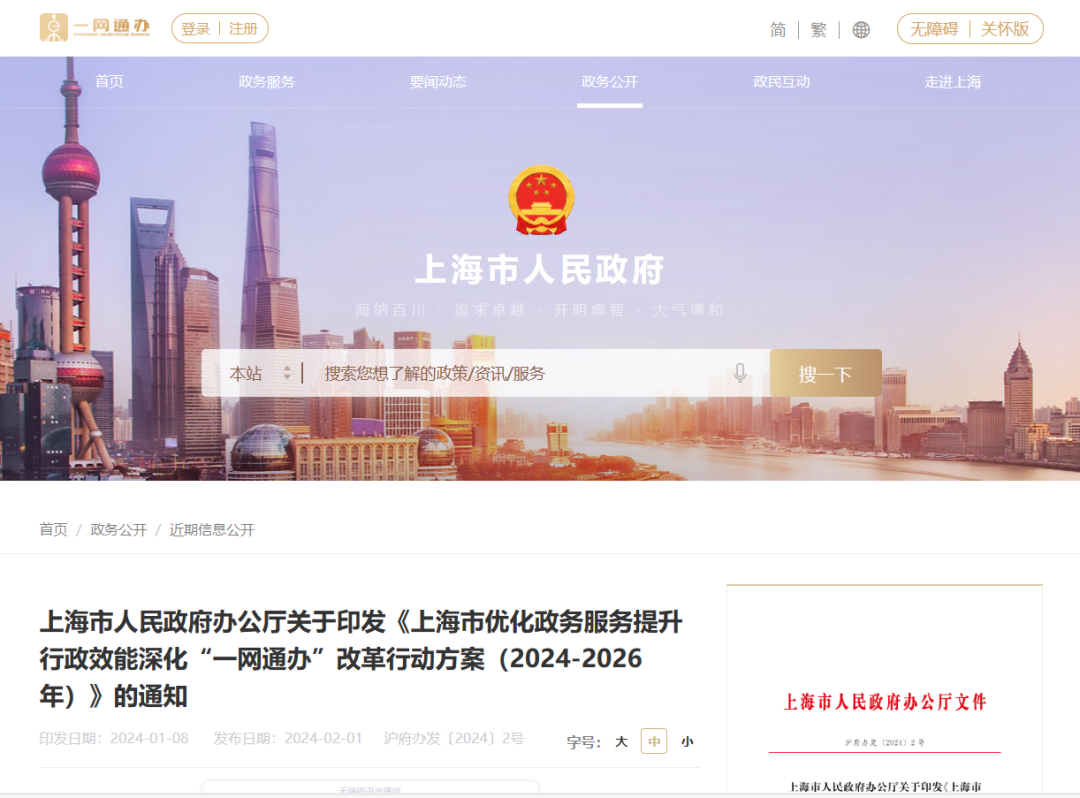 《上海市优化政务服务提升行政效能深化“一网通办”改革行动方案(2024-2026年)》印发