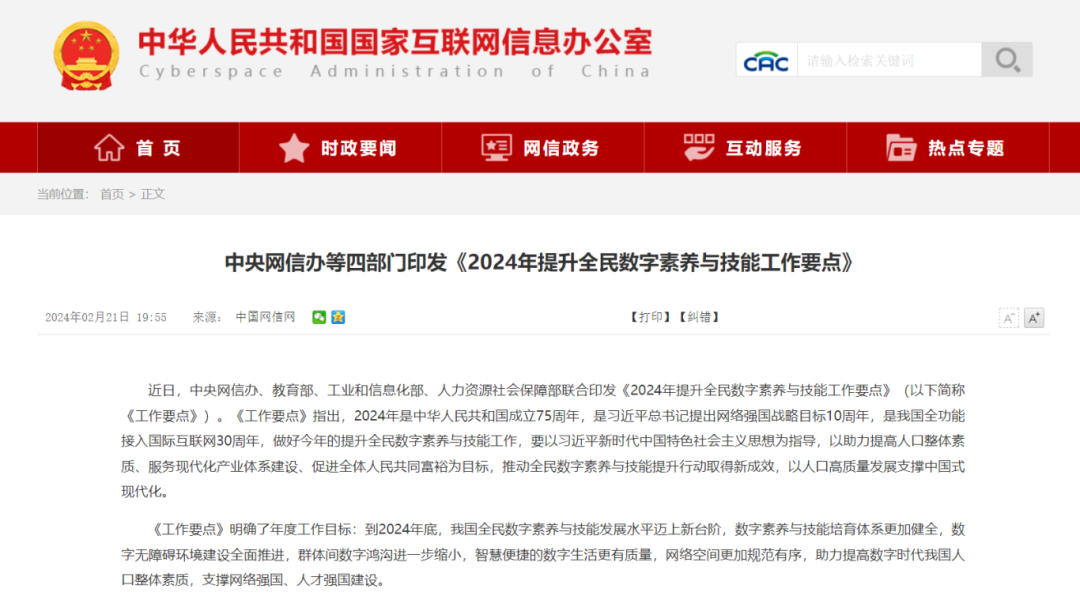 中央网信办等四部门印发《2024年提升全民数字素养与技能工作要点》