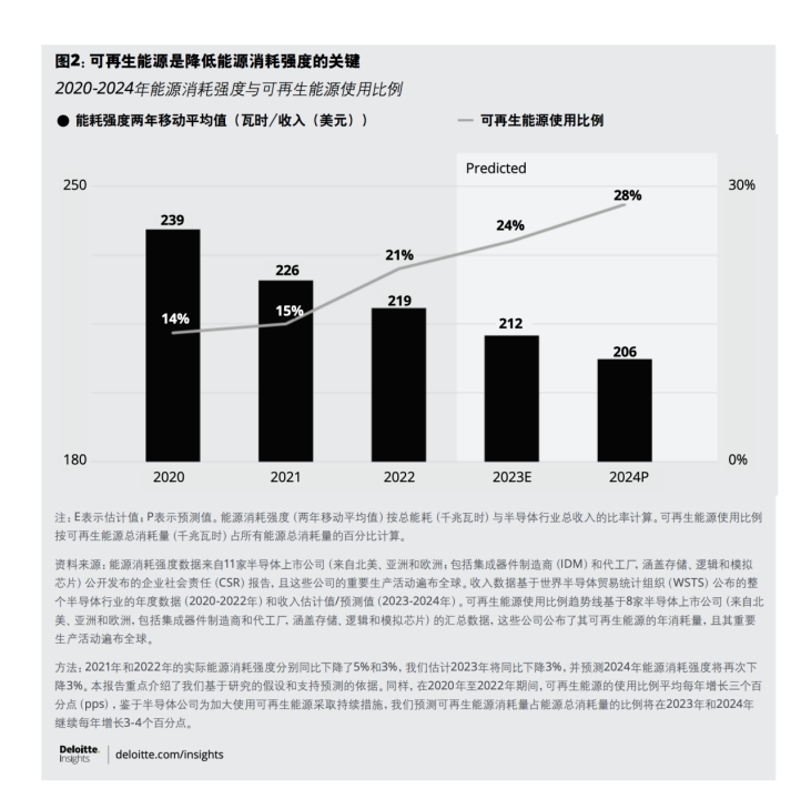 当然其中最为重要的依旧是绿色电力的应用。据德勤数据电可再生能源可使该行业晶圆厂的能源消耗强度(瓦时/美元)从2020年的近240降至2022年的219,预计2024年将降至206。此外,可再生能源使用比例预计将以高于能源消耗强度降幅的速度上升:预计到2024年,可再生能源将占能源构成的28%,是2020年的两倍。
