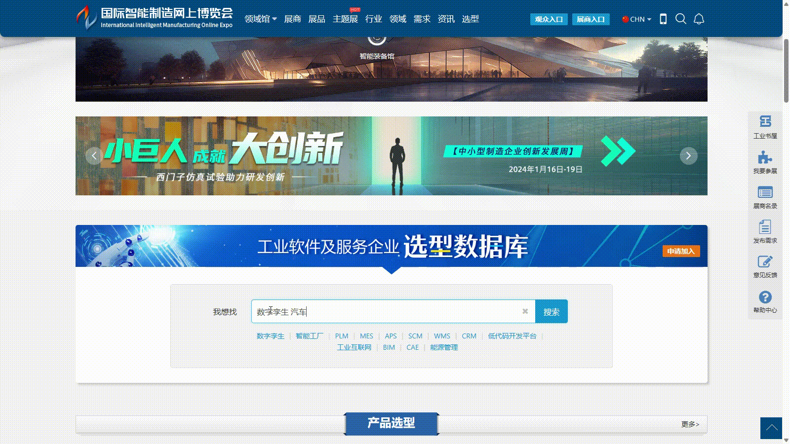 在智能制造领域,优质的选型平台不仅能够帮助企业找到合适的解决方案,还能够提供详细的产品信息和专业的技术支持与定制化服务,确保企业在工业软件应用的道路上能够做出明智决策。企业在应用选型平台时,也可以从自身的具体需求出发,如领域特性、产品种类、技术支持、用户体验等因素,不断完善选型所需。以下为读者推荐一个专注于产品选型(工业软件为主)的在线平台——国际智能制造网上博览会。