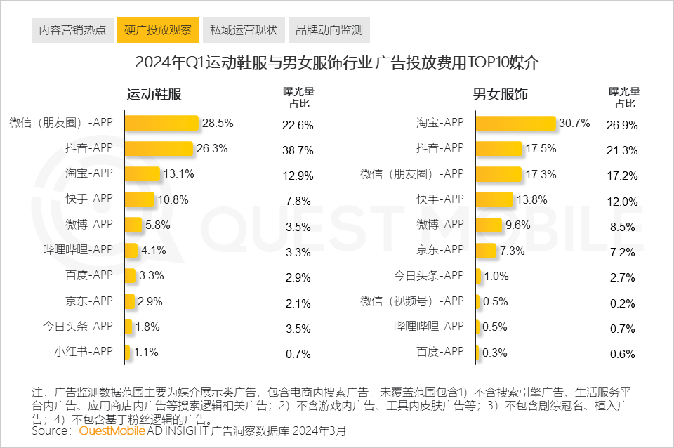 QuestMobile数据显示,2024年Q1相比去年同期,运动鞋服品类投放的效果广告费用占比上升个9.2百分点,男女服饰品类投放的效果广告费用占比上升2.2个百分点。
