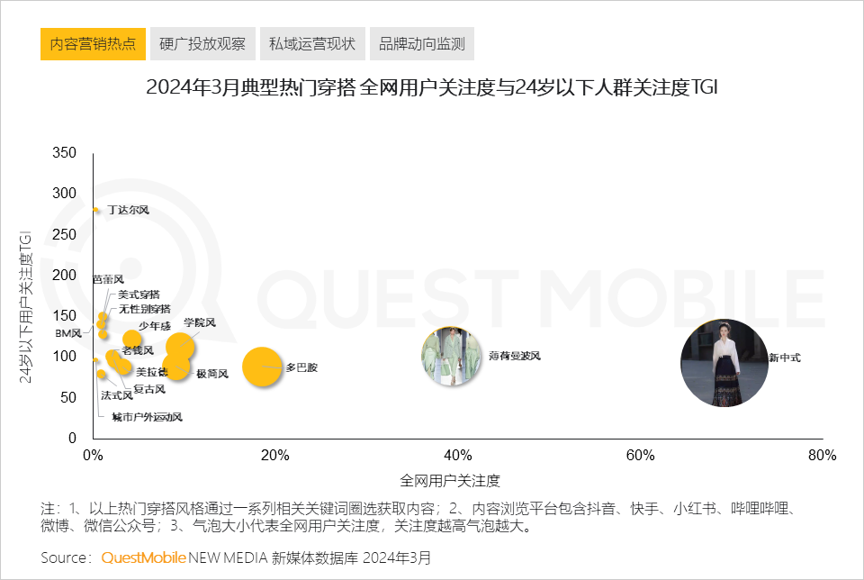 Ⅳ.新中式与薄荷曼波风穿搭受全网用户关注度最高,此外24岁以下年轻用户的喜好更“小众”,走在时尚前沿,对丁达尔风、芭蕾风、无性别穿搭内容呈现高度偏好