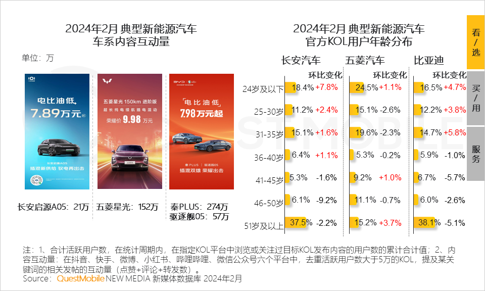 QuestMobile数据显示,典型新能源车企扩大广告“攻势”并深耕泛内容平台,2月正式打响“价格战”后,长安汽车、比亚迪官方KOL 35岁以下用户增长,相比之下五菱汽车KOL吸引更多24岁以下、41岁以上用户。