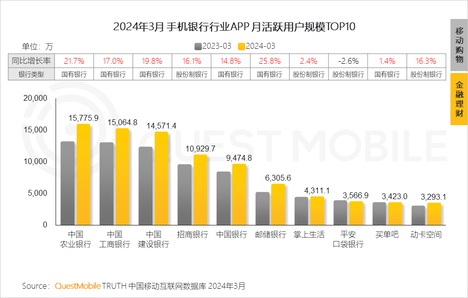 4.12手机银行TOP10 APP中月活跃用户规模普遍同比增长,国有银行占领六席
