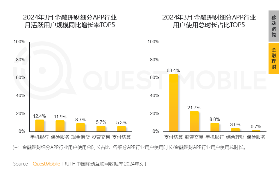 4.10细分行业方面,手机银行、保险服务等行业活跃用户规模同比增长较快,超10%;支付结算行业用户使用时长占比最高,达63.4%