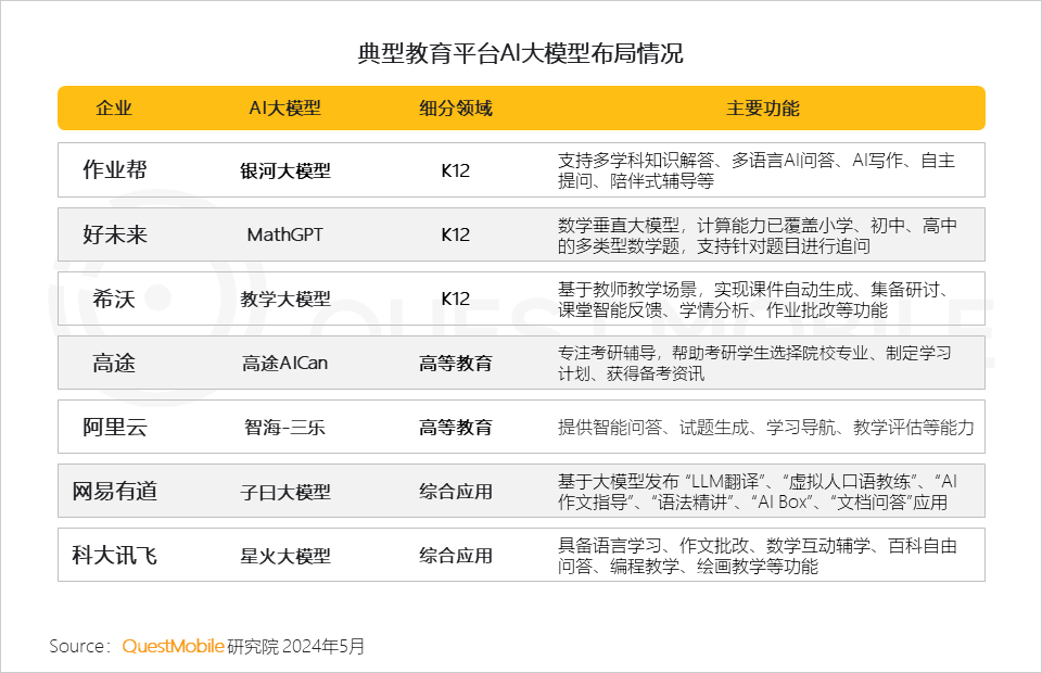 Ⅲ.AI大模型落地在线教育,各企业的自研教育大模型陆续发布,并逐步落地应用,为用户提供个性化分析与指导、引导陪伴式学习、知识整合