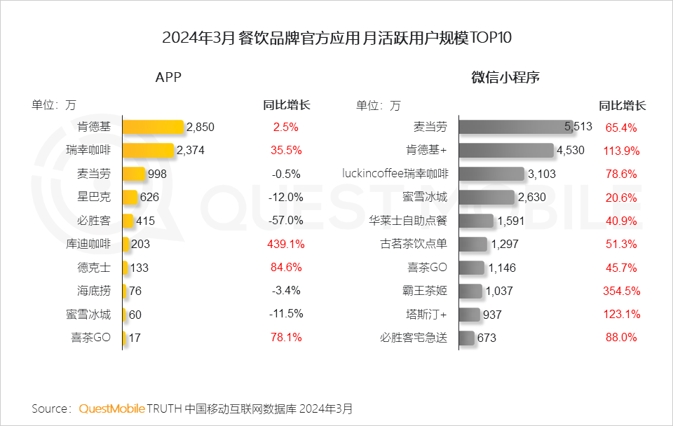Ⅵ.餐饮品牌以微信小程序作为主要的线上点单渠道,TOP10品牌流量均保持快速增长;APP端则承担更多功能,品牌通过会员积分活动留存私域用户