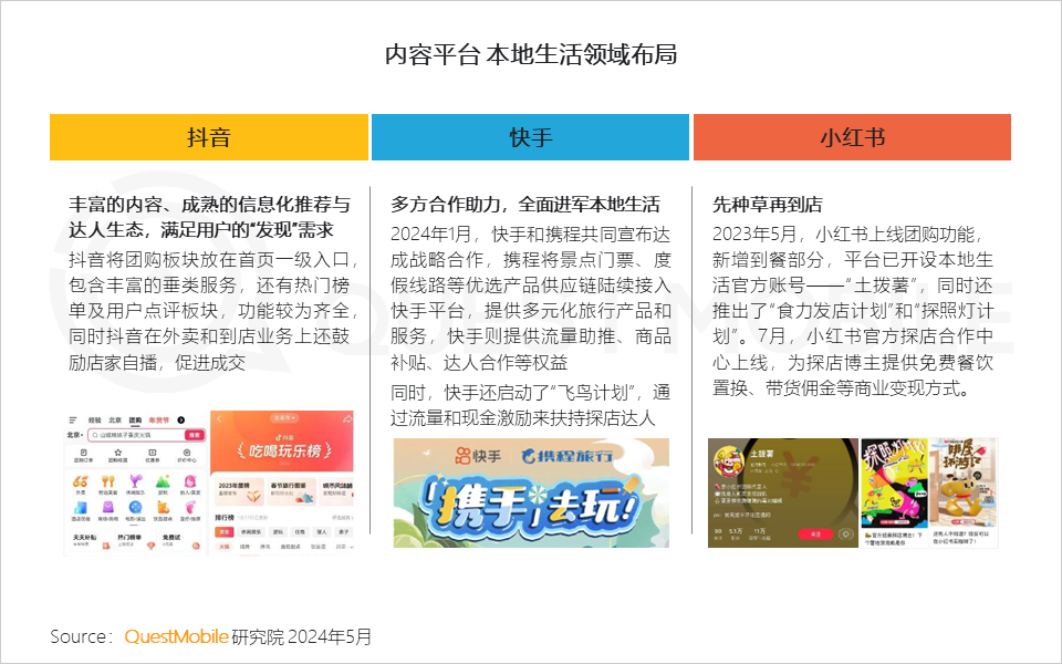 Ⅱ.内容平台入场,到店业务竞争加剧,抖音、快手、小红书在本地生活领域的打法逐渐成熟,受众也开始习惯内容种草+线下消费的模式