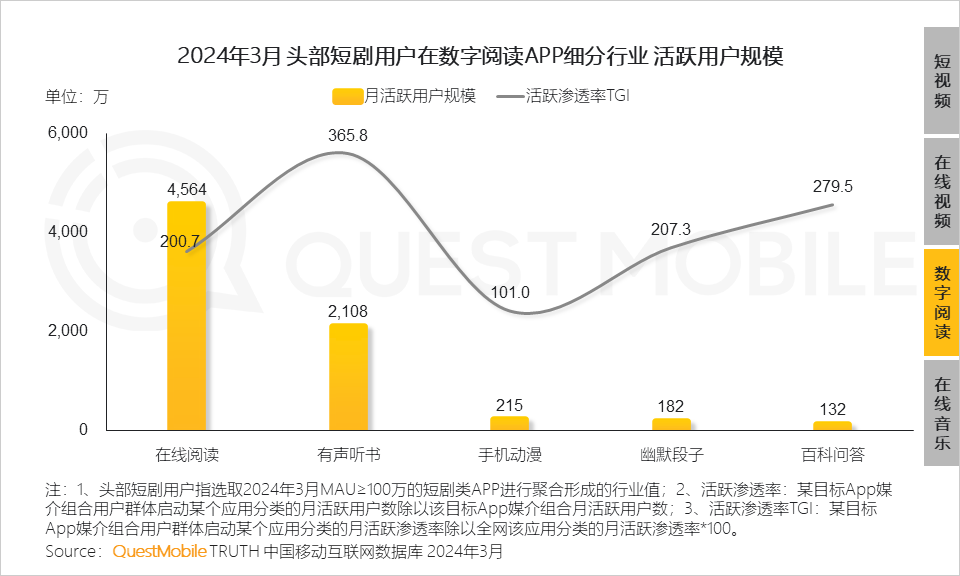 1.6短剧用户对于数字阅读表现出较强偏好,头部短剧用户在在线阅读、有声听书行业活跃规模均超2,000万,活跃渗透率TGI分别高达200.7、365.8