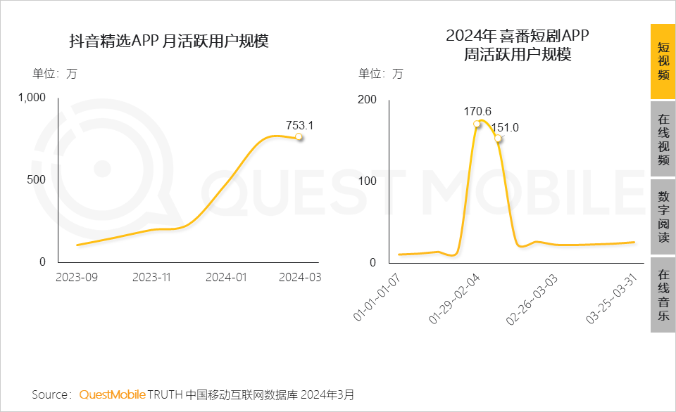抖音精选APP是抖音旗下中长视频版本,喜番短剧为快手上线的一款独立短剧APP,QuestMobile数据显示,截止2024年3月,抖音精选APP月活跃用户规模达753.1万;喜番短剧APP春节期间流量增长显著,春节周活跃用户规模突破150万。