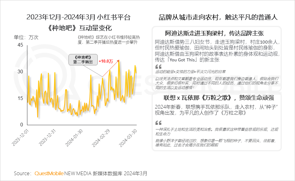 7.5从城市营销走向农村营销;人们对田野生活和乡土的向往,推动《种地吧》综艺的火热,品牌也发现了新的营销土壤,走进农村,围绕普通人、朴素生活展开,引发用户共鸣