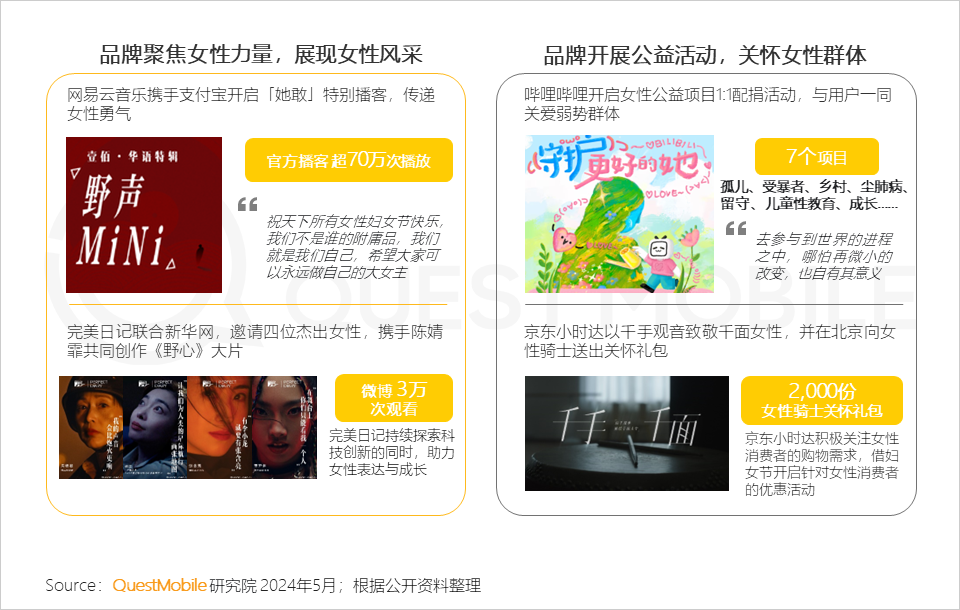 2024年3月8日,是中国首次公开纪念国际妇女节100周年,各品牌深入洞察女性群体,从不同方面展示女性风采、为女性公益出力,展现品牌对用户情绪满足、精神关怀的重视。