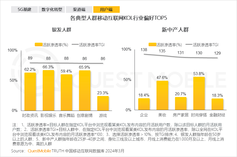 6.7银发人群偏好时政资讯、影视娱乐类KOL,关注社会热点,追求娱乐休闲,对成熟内容有较高接受度;新中产人群追求职业发展和生活质量提升,借助企业、美妆类KOL获取相关专业知识