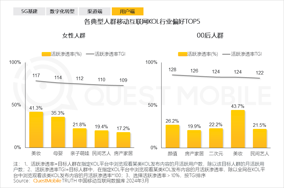 6.6女性人群倾向于关注美妆和母婴领域的KOL以获取相关建议和信息;00后人群通过颜值类KOL了解时尚审美等信息,借助房产家居类KOL获取相关信息