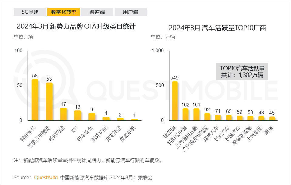 4.8【产业的数字化-OTA】2024年3月,汽车行业OTA升级项较上月显著上升,达534项,其中6成以上由新势力品牌贡献