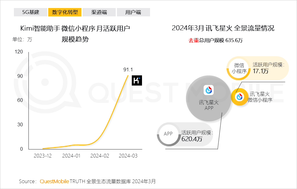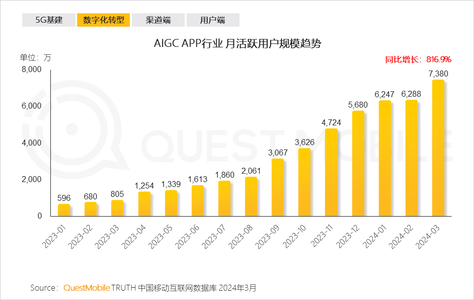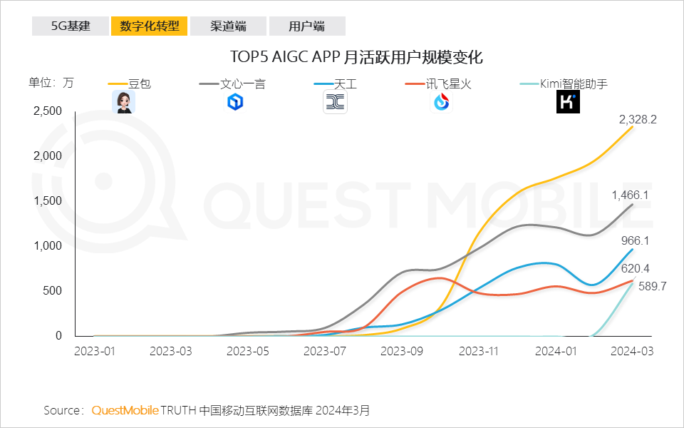 数字产业化的典型代表是AIGC,截止到2024年3月,AIGC APP行业用户已经突破7380万,同比增长了8倍,其中,抖音旗下的豆包、百度旗下的文心一言以及天工、讯飞星火、Kimi智能助手月活跃用户分别为2328.2万、1466.1万、966.1万、620.4万、589.7万。