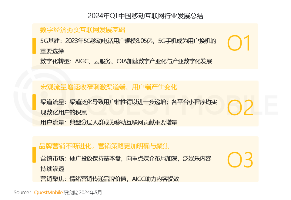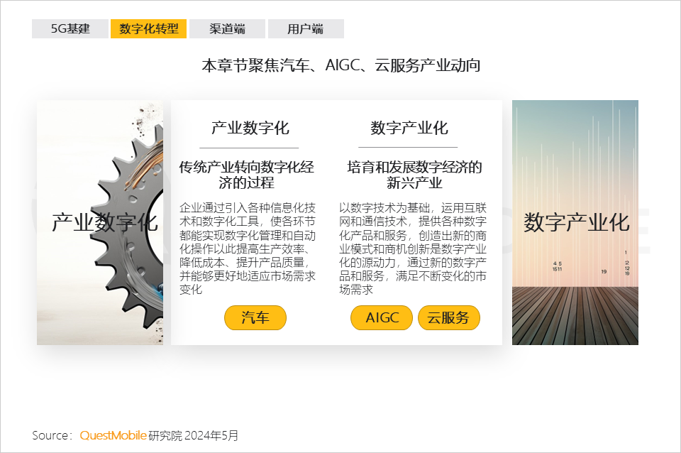 言归正传,今天就给大家分享一下2024中国移动互联网春季大报告。如2019年Mr.QM分析的,随着数字化、智能化一环扣一环的持续提速,产业数字化与数字产业化,将成为移动互联网的爆点,当前,这些落点和应用已经“开花结果”,比如5G应用带来AIGC、云计算的持续增长,智能电视终端和智能汽车的持续扩张,显然最终都会助力新质生产力建设。