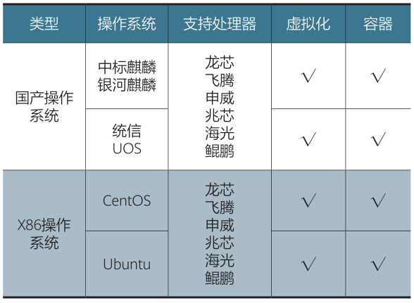 在操作系统方面,国产操作系统和传统云架构使用的操作系统在处理器的支撑能力上几乎一致,而且同时也支持虚拟化和容器技术,如表2所示。