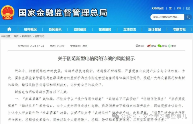 2024年7月24日,国家金融监督管理总局发布《关于防范新型电信网络诈骗的风险提示》。全文如下:
