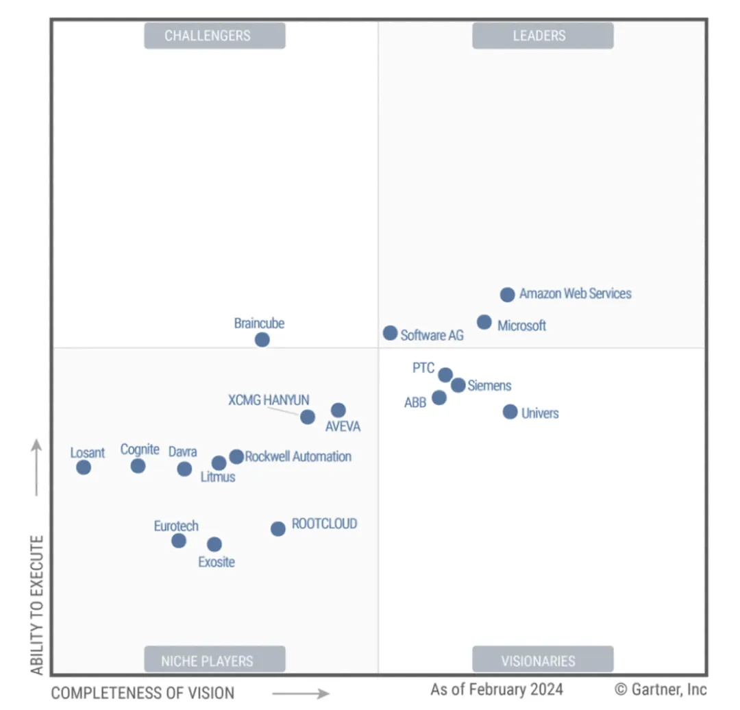 在上述榜单中,GE Digital、IBM和Oracle均为2019年和2020年上榜;微软在2020年上榜之后,一直位居领导者象限;PTC和Software AG连续五年上榜,且排名靠前;亚马逊云在2020年上榜之后,逐渐进入领导者象限;西门子入选了近三年的榜单,且一直位于远见者象限;ABB入选了近三年的榜单,且最近两年处于远见者象限;日立入选了前四届榜单,且排名较高;三星SDS入选过2020和2021年的榜单,处于利基厂商象限;树根互联和Eurotech连续五年上榜,一直位于利基厂商象限;徐工汉云入选了近两次的榜单,位于利基厂商象限。