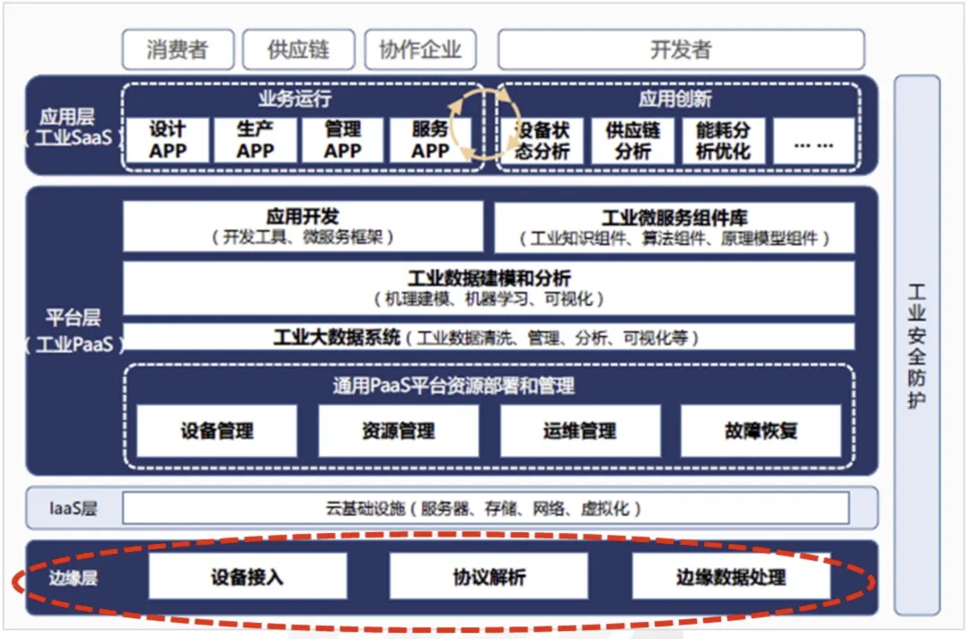 根据我国工业互联网联盟(AII)发布的工业互联网平台架构,工业互联网平台分为边缘层、IaaS层、平台层和应用层,其中,边缘层完成设备接入、协议转换和边缘数据处理。