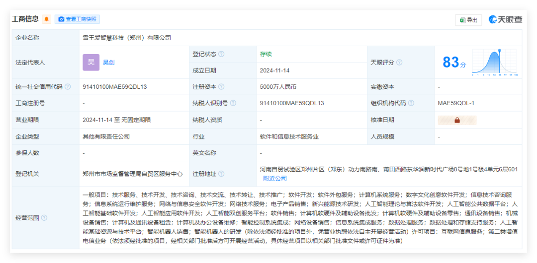 近日,蜜雪冰城通过两家子公司联合投资成立了雪王爱智慧科技(郑州)有限公司,注册资本为5000万人民币,法定代表人为吴剑。