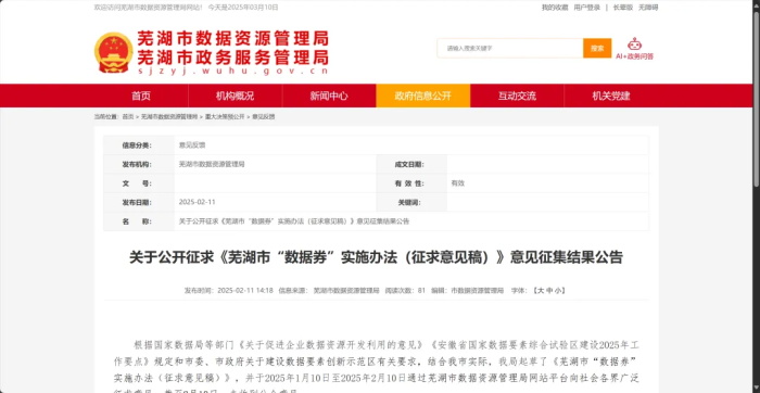 近日,芜湖市政府正式发布《芜湖市“数据券”实施办法(试行)》,成为长三角区域首个以“数据券”推动数据要素市场化配置的城市。