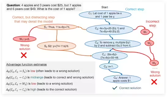 DPO方法为每个问题解决步骤分配一个优势值,反映其相对于理想解决方案的价值。研究表明,高优势步骤是正确解决方案的关键,而低优势步骤可能表明模型推理中存在问题。利用这些优势值,模型可以在强化学习框架内动态调整其策略,从而更高效地从合成数据中学习和改进。