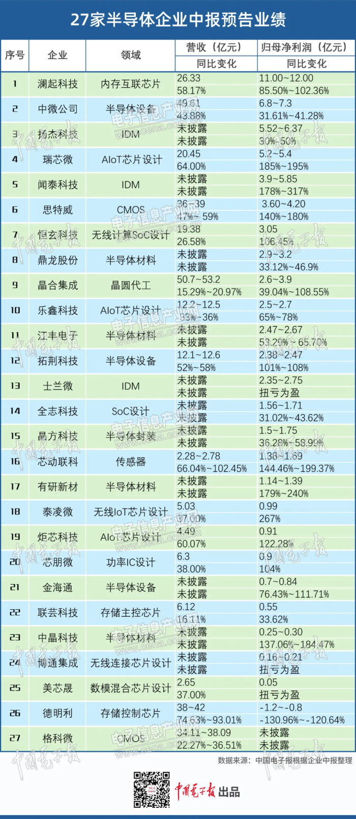 在记者统计的27家半导体企业中报预告中,仅一家归母净利润亏损、一家未公布、三家扭亏为盈。其余22家归母净利润均实现不同程度增长,其中10家增幅(取区间中值)为三位数。