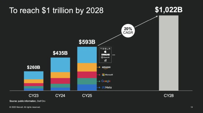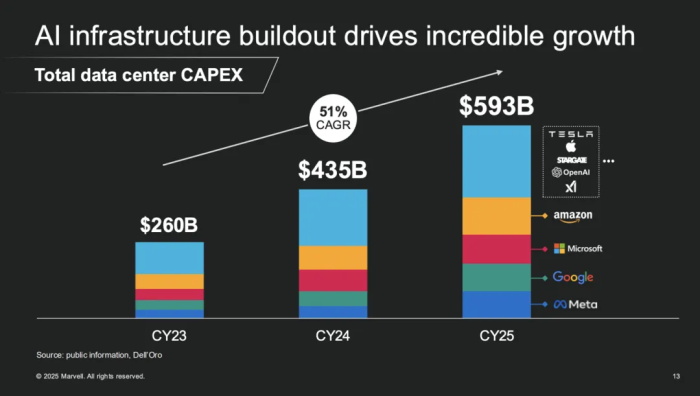 Marvell在6月举办的Custom AI研讨会上指出,2024年北美云计算四巨头的资本支出增长至超过2000亿美元,预计2025年将超过3000亿美元,其中一大部分资金将投向定制芯片。同时,Marvell还观察到,xAI、苹果等新兴玩家正在投资自己的数据基础设施,定制化趋势已突破传统巨头体系,向更广泛的客户群扩散。